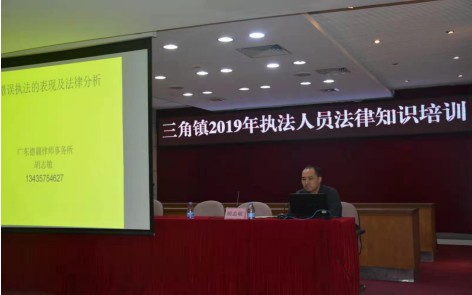 2019年11月22日上午,广东德疆律师事务所胡志敏律师应中山市三角镇人民政府之邀,为镇属的各执法单位40多名执法骨干进行行政执法培训。胡志敏律师详细讲解了钓鱼式执法等七种错误执法的表现、典型案例、合法性分析、社会危害,并就如何避免错误执法提出了建设性意见或建议,课后,胡志敏律师还与各执法骨干讨论了在执法过程中如何贯彻执行执法信息公示制度、全过程记录制度、重大执法决定法制审核制度。