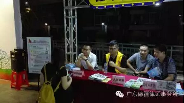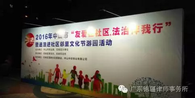 2016年6月24日晚,广东德疆律师事务所根据中山市司法局石岐区司法所、石岐区普法办公室的安排,由马校培律师到石岐区颐和山庄小区中心广场参与主题为“友爱在社区,法治伴我行暨送法进社区邻里文化节”的普法宣传游园活动。