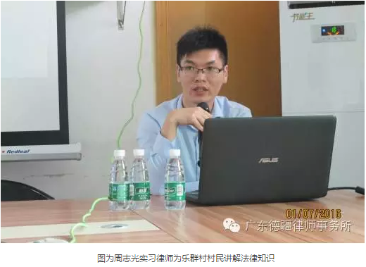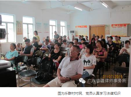 2016年7月1日下午,广东德疆律师事务所应沙溪镇乐群村委会的邀请,由周志光实习律师到沙溪镇乐群村村委会举行主题为“我们身边的法律”的法律知识讲座,与会人员有沙溪镇乐群村党员、村民及村委会工作人员等。