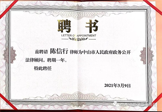 我所主任陈信行律师受聘担任中山市人民政府政务公开法律顾问,同时受聘担任中山市横栏镇人民政府、中山市神湾镇人民政府、中山市人民政府石岐区街道办事处及中山市神湾镇总工会的常年法律顾问。此外,我所其他律师亦受聘担任中山市大涌镇综合治理维护稳定办公室、中山市东区新村股份合作经济联合社及中山市横栏镇总工会的常年法律顾问。
