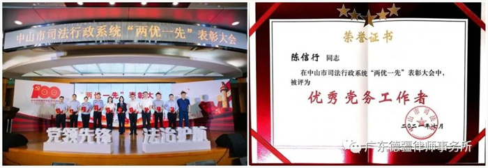 我所党支部书记陈信行律师荣获“优秀党务工作者”,展现了新时期党员律师的良好形象和精神风貌,营造了弘扬先进、崇尚先进的良好氛围。