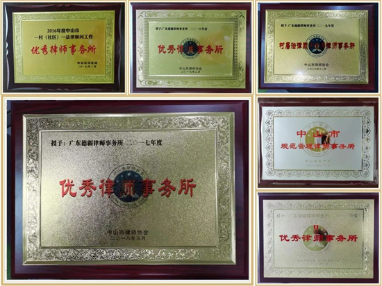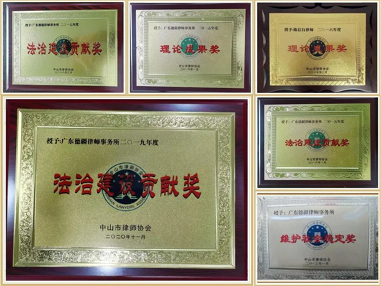 德疆所专业、优质的法律服务,赢得业界和客户的信任。自成立以来,获得省、市级司法行政机关及律师协会颁发的奖项、荣誉等共50余项,被授予“全省优秀律师事务所”、“中山市优秀律师事务所”、“中山市规范管理律师事务所”、“中山市村居先进律师事务所”、“广东省参与村(社区)法律顾问工作先进党组织”、“中山市热心公益奖”、“中山市维护社会稳定奖”、“中山市法制建设贡献奖”、“中山市理论成果奖”、“中山市爱心贡献奖”、“中山市服务业新兴业态企业”、“中山中小微企业创新创业公共服务平台专业服务机构”等荣誉。