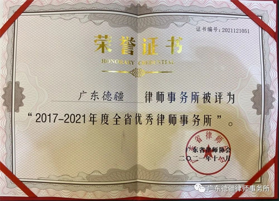 德疆所先后荣获“广东省参与村(社区)法律顾问工作先进党组织”“中山市优秀律师事务所”“中山市规范管理律师事务所”“中山市热心公益奖”“中山市维护社会稳定奖”“中山市法制建设贡献奖”、“中山市理论成果奖”“中山市村居先进律师事务所”“中山市爱心贡献奖”“中山市服务业新兴业态企业”“中山中小微企业创新创业公共服务平台专业服务机构”等多项荣誉。