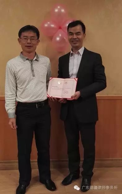 图为广东省律师协会监事会副总监事叶纬为陈信行主任律师颁发荣誉证书