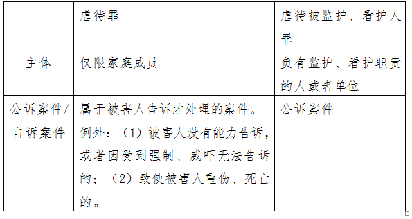 虐待罪与虐待被监护、看护人罪是两个不同的、相独立的两个罪名。两者主要有两个区别,小编为大家以更直观的表格形式呈现: