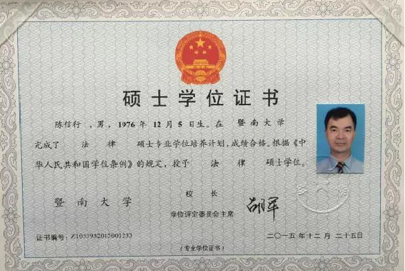 从暨南大学学位评定委员会传来消息,我所陈信行律师在暨南大学顺利完成法律硕士专业学位培养计划,成绩合格,并于2015 年12 月25 日正式授予法律硕士学位。